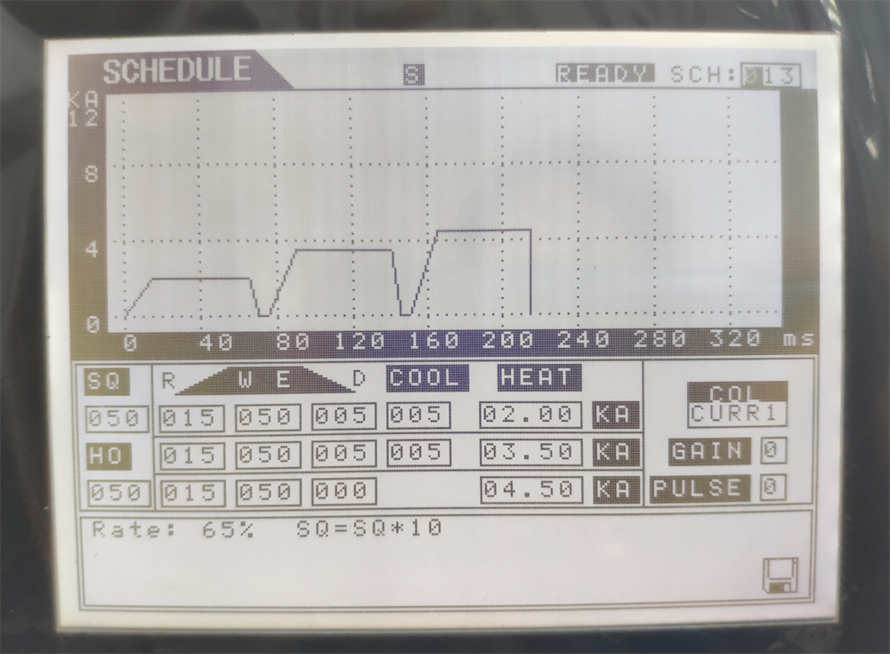 時間設定 | 預壓:0~9999ms; 緩升1,2,3: 0~300ms; 焊接1,2,3: 0~300ms; 緩降1,2,3: 0~300ms; 冷卻: 0~999ms; 保持: 0~9999ms; 焊接脈沖循環(huán): 0~9 | |||||